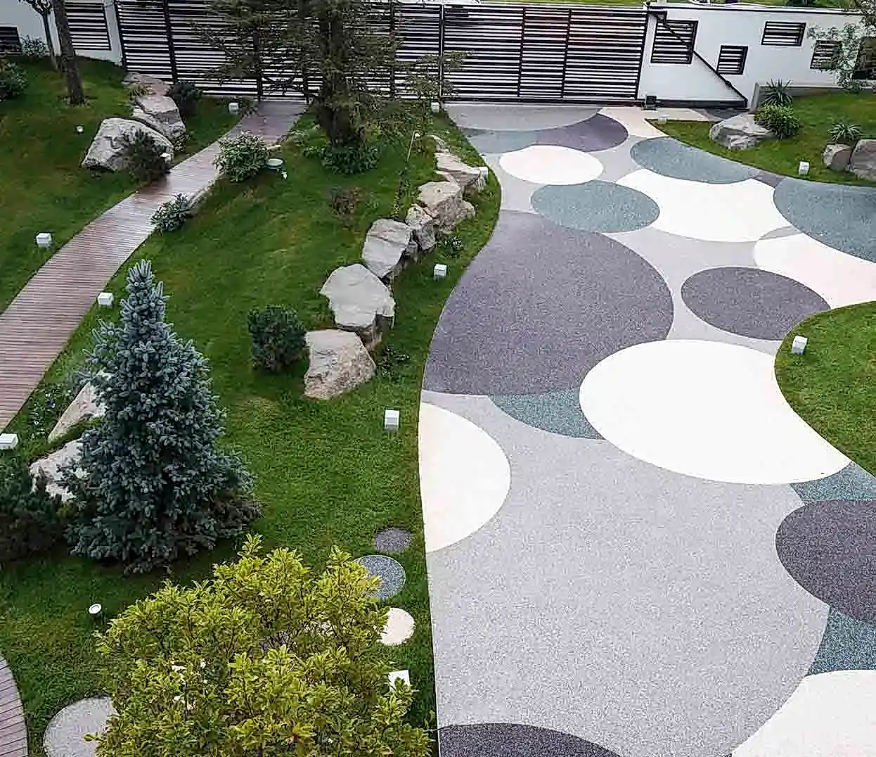 Taş halı, doğal çakıl taşları, mermer granülleri ve özel epoksi veya poliüretan reçineler karıştırılarak oluşturulan, pürüzsüz ve şık bir zemin kaplama malzemesidir. Bu malzeme hem dekoratif hem de işlevsel bir çözüm sunar ve farklı zeminlere kolayca uyar. Böylece, açık gözenekli yapısı sayesinde suyun zeminden akmasını sağlar.
